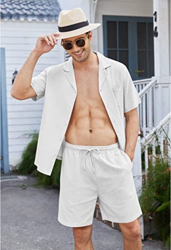COOFANDY Men's Linen Shirt Short Sleeve Button Shirt Beach Hawaii 2 Piece Shorts Set