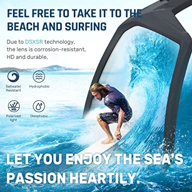 TOREGE LENS TECHNOLOGY - DSX-SR Saltwater Resistant Hydrophobic & Olephobic coating technology Protects mirrored lenses from being corroded by seawater.100% polarization kills reflected glare and reduces eye strain,colorful coating enhances vision and contrast, great for fishing inshore and on flats. TOREGE TAC material lens provides high clarity, impact- and scratch-resistance along with lightweight all day wear-ability.