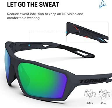 TOREGE FRAME TECHNOLOGY -TOREGE sunglass frames are lightweight, extremely flexible, and heat and UV resistant.Durbility and lightweight TR90 frame with no-slip nose pad and temple increase grip with perspiration to offering all day comfortable fit.Spring hinges are adjustable and suitable for medium to large faces.Ergonomic design fits many face shapes comfortably and all sporty event